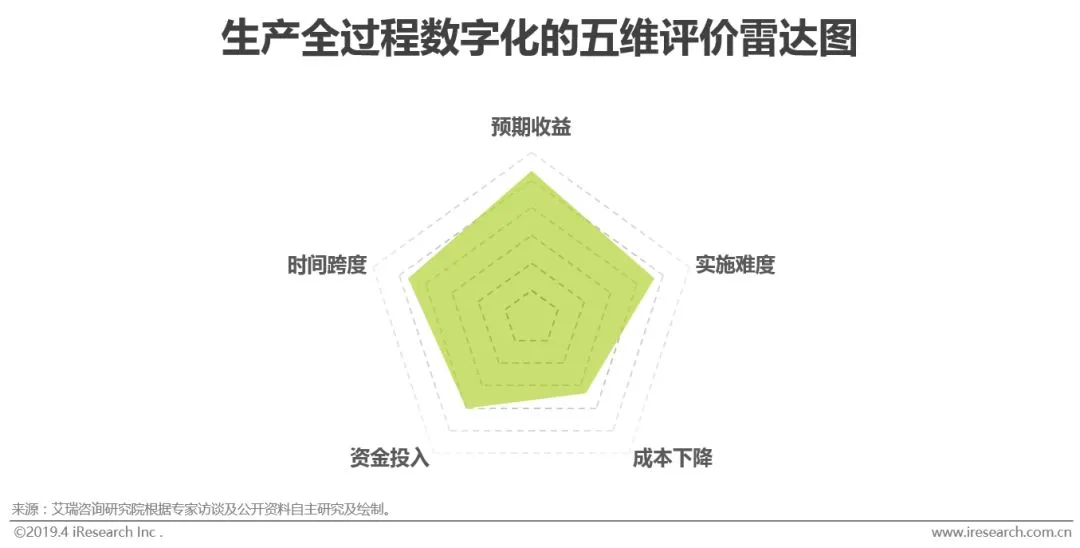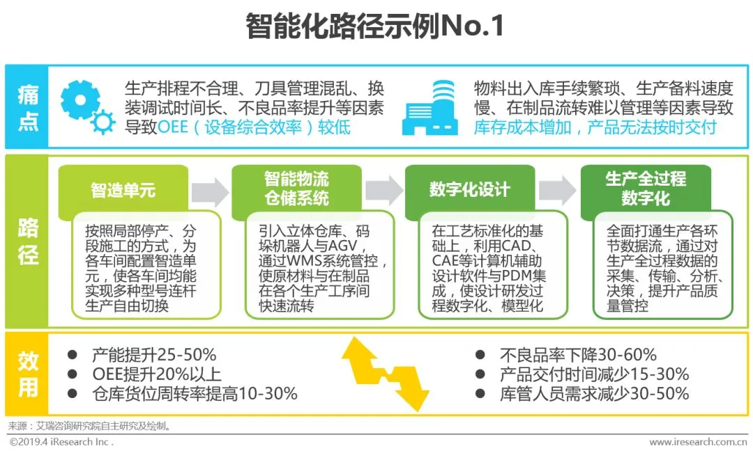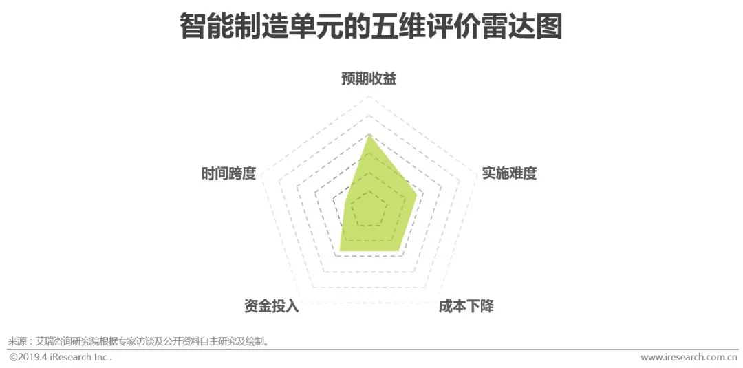 本部分对制造业企业生产活动中各个环节的六种典型智能制造能力从预期收益、实施难度、成本下降、资金投入、时间跨度五个维度进行分析评价,并以此为基础提出智能化路径示例。