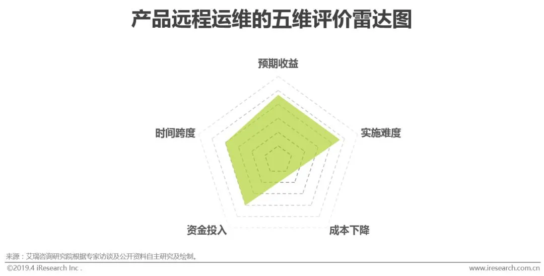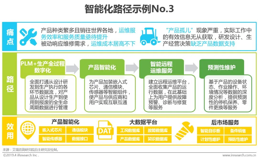 远程运维服务可以有效降低设备故障率,提升设备使用率与使用寿命,既能减轻制造商的负担,又能显著提升产品价值。远程运维对于企业产品的智能化程度要求较高,产品必须配备开放的数据接口,具备数据采集、通信模块;企业还需建立远程运维服务前端平台与后端数据中心,采集产品数据并基于大数据分析与计算,向用户提供增值服务。