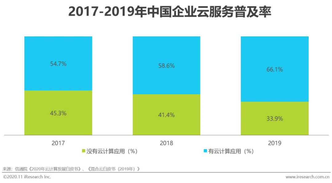 企业级SaaS发展的第二个基础要素是云服务发展水平,这一要素既决定了SaaS产品的服务能力,也影响了用户对云服务的使用意愿。现今SaaS有公有云、私有云、混合云等多种部署形式,但公有云仍是最传统、最主要、最被广泛使用的形式,然而一些企业对公有云稳定性、安全性的疑虑削弱了其对SaaS产品的使用意愿。云服务模式在中国的普及率已从2017年的54.7%上升至2019年的66.1%,随着中国基础云厂商技术提升,市场教育逐步见效。