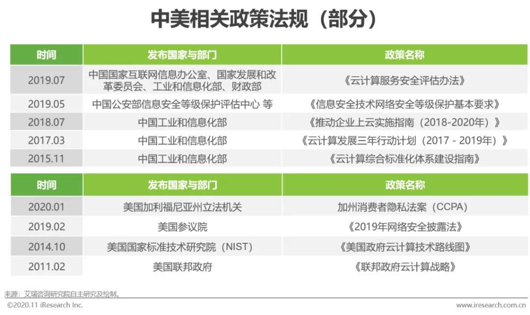 政策法规对企业级SaaS发展的推动力来自几个不同的角度。第一,针对部分企业用户担心的云端软件网络安全性问题,中美均出台了关于保障用户隐私、电子通信隐私和信息安全的法律法规,对云服务的服务质量作出规范。第二,政府出台《推动企业上云的实施指南(2018-2020年)》等,使一部分企业新增了对SaaS软件的需求。第三,一些政策法规虽与云服务并无直接相关,但是促成了企业对深耕行业的垂直型工具型SaaS产品的需求,如美国企业在员工管理上需要遵循各人种无歧视雇佣等原则,高昂的罚款促使企业需要HRSaaS管理软件帮助其实现合规管理。整体而言,政策的推动力来自于帮助企业增强使用信心、激活企业使用需求。