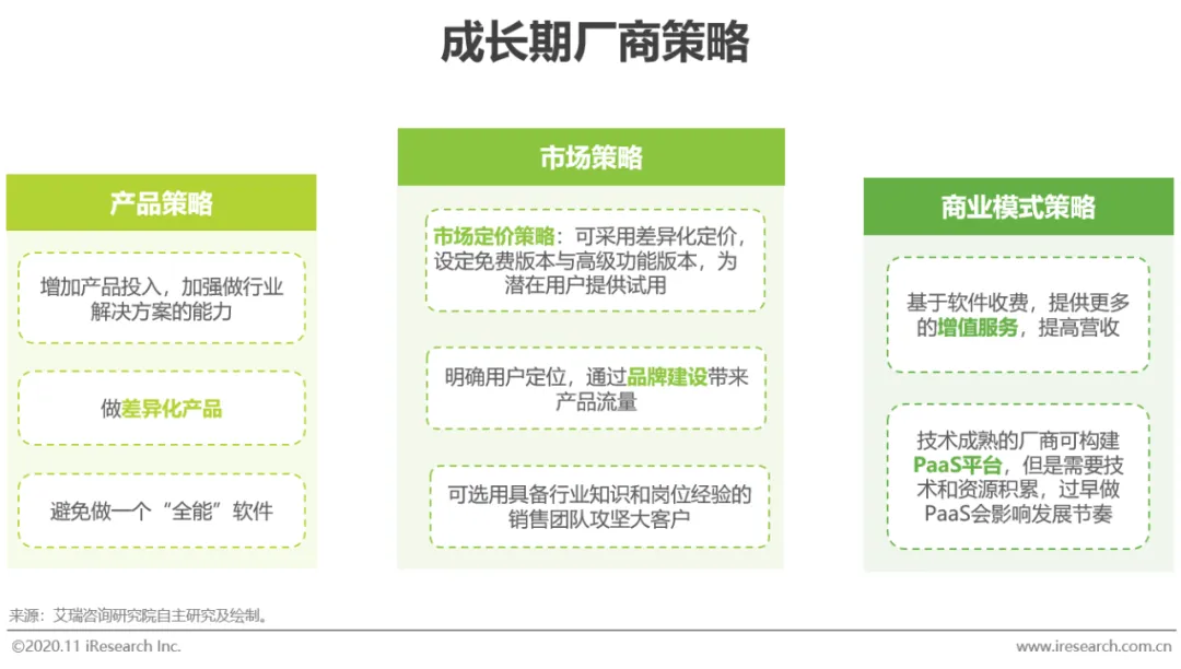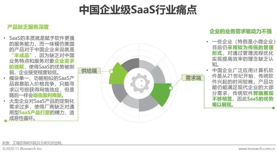 企业级SaaS在中国处于市场繁育期,需求端和供给端的一些不足成为行业发展的掣肘。首先,从供给端的角度,可以认为很多SaaS产品仅仅是“半成品”,因为其虽拥有软件功能,但是产品对业务的理解缺乏深度,无法为客户提供能解决核心业务难题的解决方案,在SaaS(SoftwareasaService)的概念下,缺乏服务能力的SaaS产品是不完整的,所以企业也并不愿意为与需求割裂的SaaS付费。其次,从需求端的角度,企业使用SaaS软件的意愿和付费意愿均不够强,需求端驱动力不足使得SaaS厂商难获新客、难增营收。