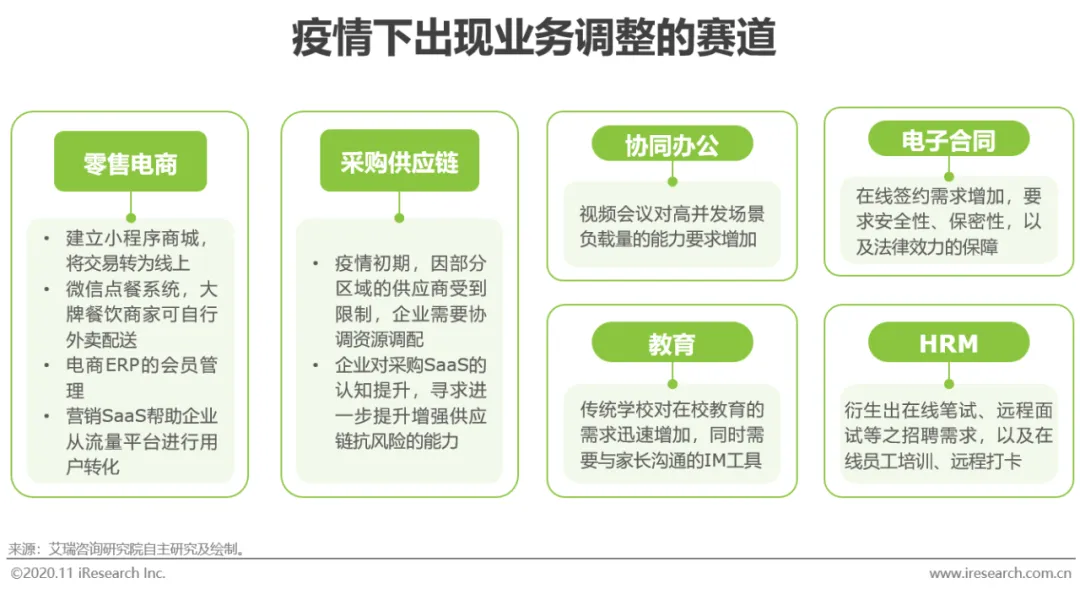 新冠疫情加快了市场教育进程:受新冠疫情影响,传统的线下零售、餐饮、采购等活动受阻,企业对零售电商、协同办公、CRM、数字化采购等领域SaaS产品的需求显著增加,带动部分小微企业初步涉足SaaS产品的尝试,市场教育取得进展。