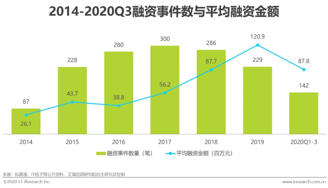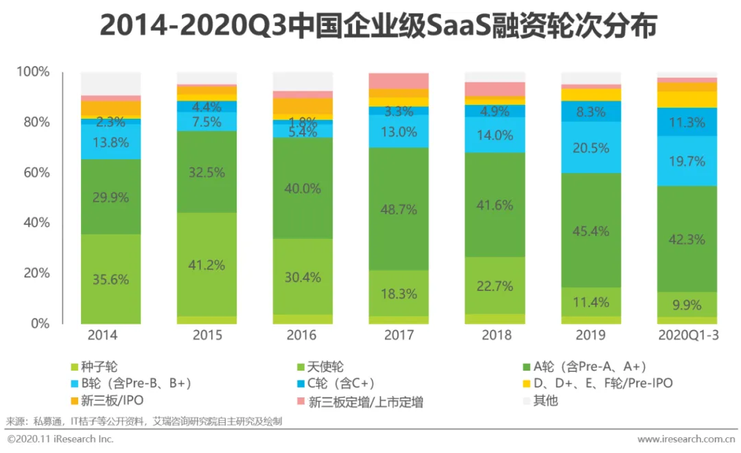 通过2014到2020年Q3的融资轮次图可以发现,B轮和C轮事件数比重增加,种子轮占比相比2016年有显著下滑,2019和2020年表现得尤为明显。融资事件数也从2019年起有所下降,但是平均融资金额整体呈上升趋势,并在2019年创下新高,虽然2020年受疫情影响有所回落,但是平均融资金额仍保持在超过2018年同期的水平线上。上述现象说明投资人更青睐已有成熟产品和可行的商业模式的创业厂商,企业级SaaS的创业热潮逐渐消退,行业投资趋于理性。