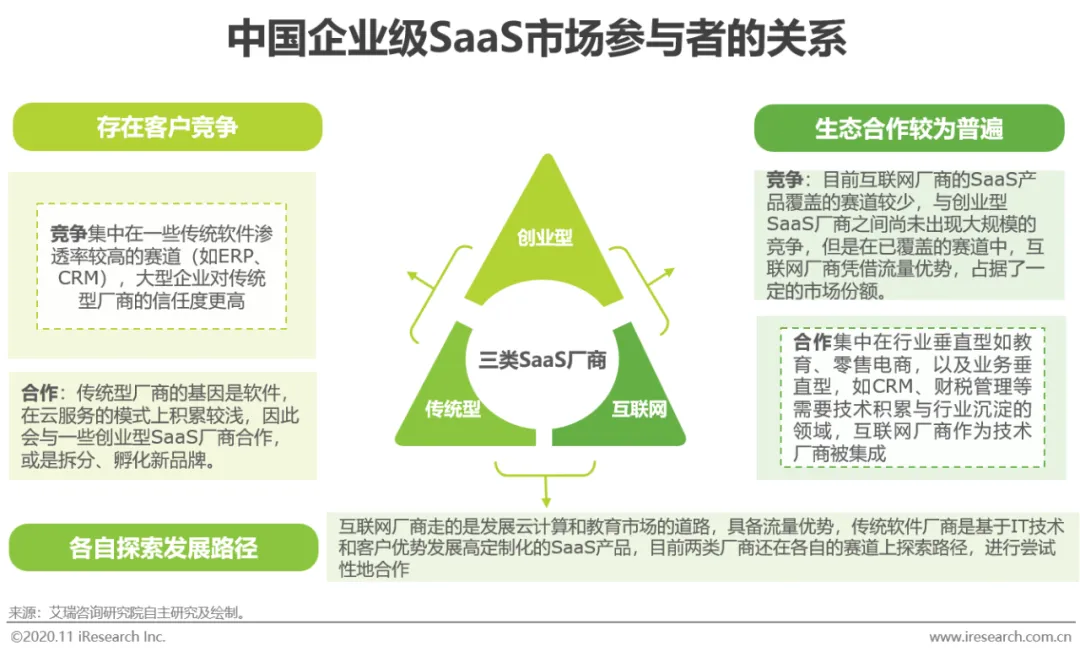 传统软件厂商、创业型SaaS厂商和跨界互联网厂商之间既存在竞争也存在合作。目前中国的SaaS行业仍处于腰部厂商探索成长、头部厂商逐步扩张的阶段,尚未出现像美国一样市值超千万美元的SaaS巨头,面对来自传统和互联网厂商的流量及资金压力,创业型厂商具有先发优势和更落地的行业洞察能力,在于其他类型厂商的合作与竞争中不断成长。头部跨界的互联网厂商的公有云能力使其在发展aPaaS平台上会具有一定的竞争优势。