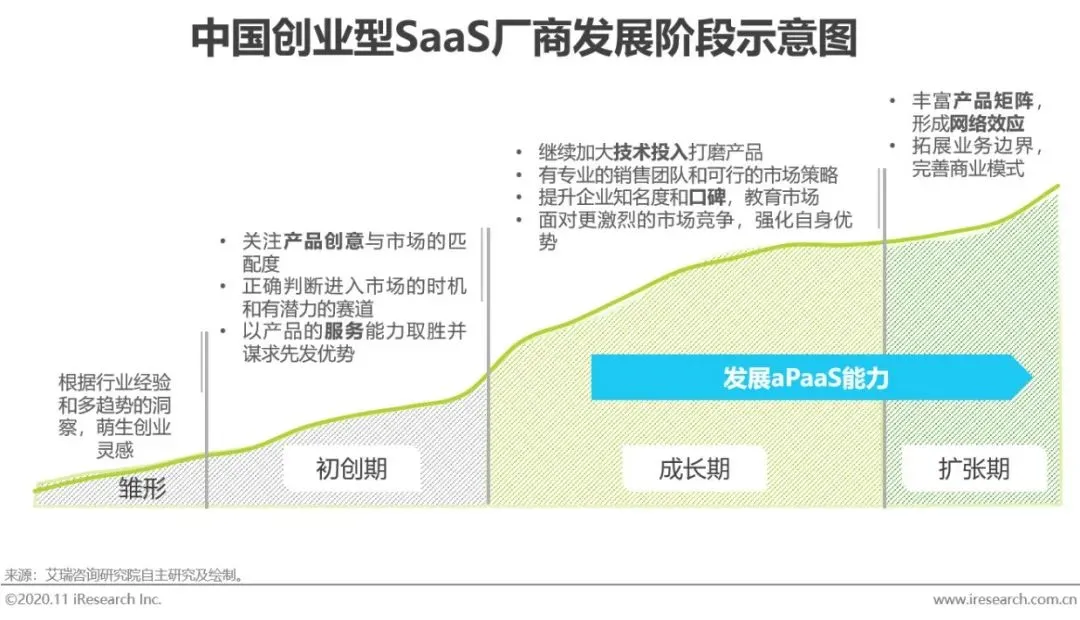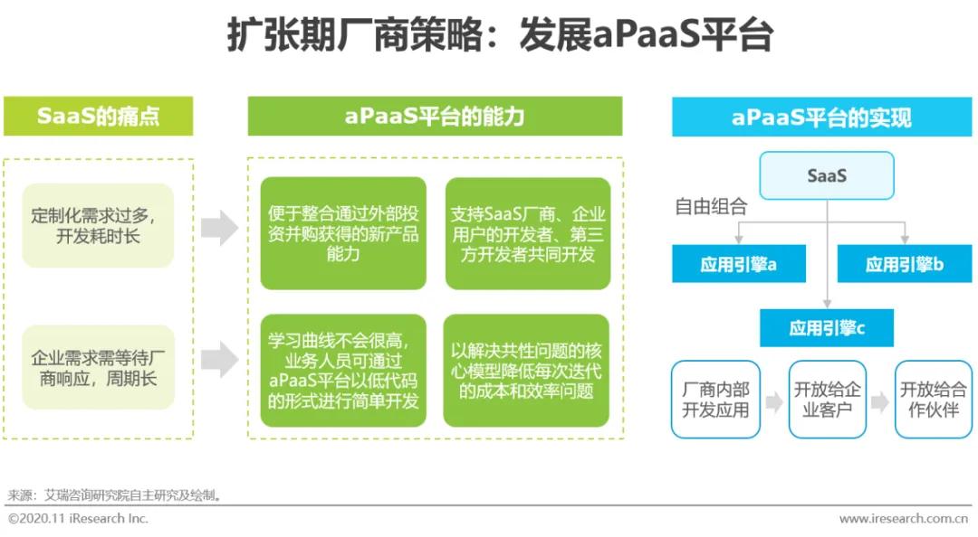发展aPaaS(Application Platform as a Service)平台是扩张期厂商的一个技术策略,是指通过将业务或应用模块抽象和沉淀为通用能力,并以一个相对标准化的形式输出,支持SaaS厂商、企业用户和第三方开发者以较低成本进行二次开发和自主开发。aPaaS平台的产生既帮助厂商解决企业强定制化需求带来的研发成本上升和效率下降的问题,又为企业用户提供了自主迭代产品开发空间,创造更大的价值链。但是并不是所有厂商都需要、都有能力做aPaaS平台,既需要SaaS厂商有一定的业务和技术沉淀,也需要行业内客户存在共性需求,才能抽象出核心模型构建aPaaS平台。