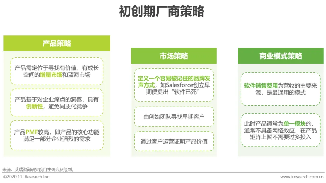 对于初创期的SaaS厂商,首先应该考虑的是如何做出一款还不错的产品。这里“还不错的产品”的评价标准是产品是否具有较高的PMF(ProductMarketFit),即产品与市场匹配度,这也是影响产品续约率的重要因素。目前行业内对于较高PMF的数值没有具体定论,但是可概括为:每月有达到行业普遍规模的销售额,以及拥有一定数量的稳定续费用户,从而最终实现客户的营收能够覆盖拓展新客户的成本。除了产品策略,市场和商业模式也是重要的考量因素。