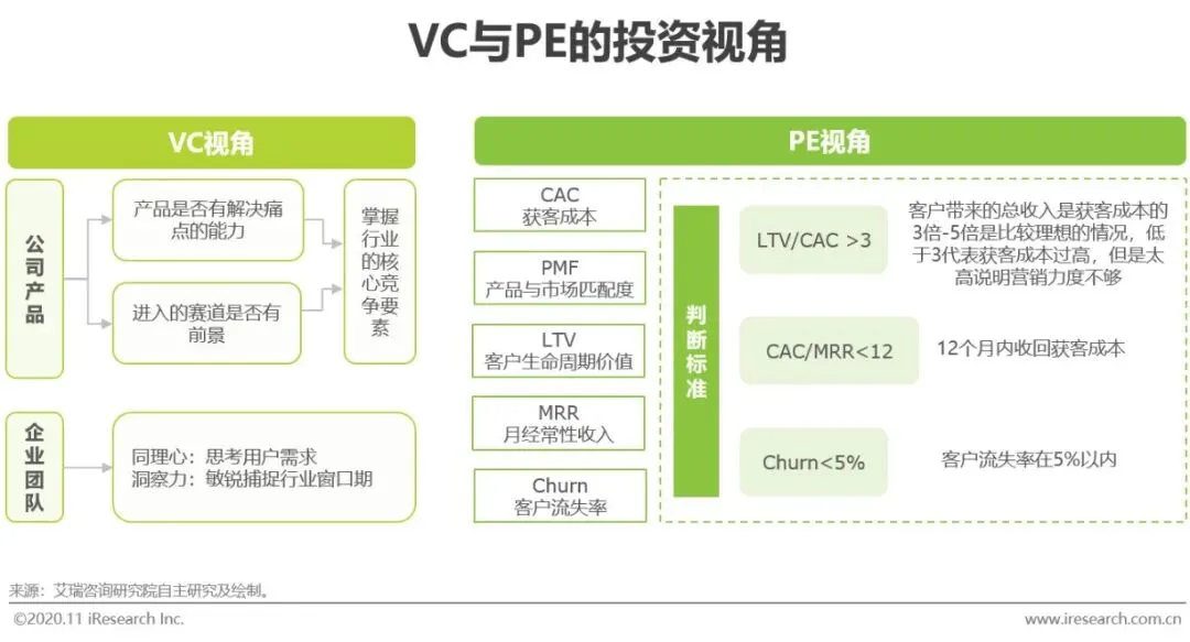 投资人通常可分为两类:VC(VentureCapital)风险投资和PE(PrivateEquity)私募股权投资。VC投资创业型SaaS厂商通常关注两方面,一方面是创业者的视角和行业认知,因为SaaS的本质还是软件,所以输出的应该是行业的最佳实践经验,即是否拥有“非对称认知”。另一方面是能否找到从0到1的增量市场,或是有较多机会的蓝海市场。PE投资更偏后期,主要看厂商的数据指标和商业模式。目前有一些已经被行业内普遍认可的判断标准,如获客成本能否在12个月内收回(CAC小于12倍的MRR), LTV/CAC是否满足略大于3这种比较理想的情况,以及通过公司的增速+利润率作出是否值得投资、是否可给高估值的判断。在进行厂商估值时,会通过判断企业经营状况预测行业天花板的高度,以及投资对象厂商做到天花板的概率得到厂商的价值量级,因此能够跨界开拓相邻市场的团队,可能会更受投资人青睐。