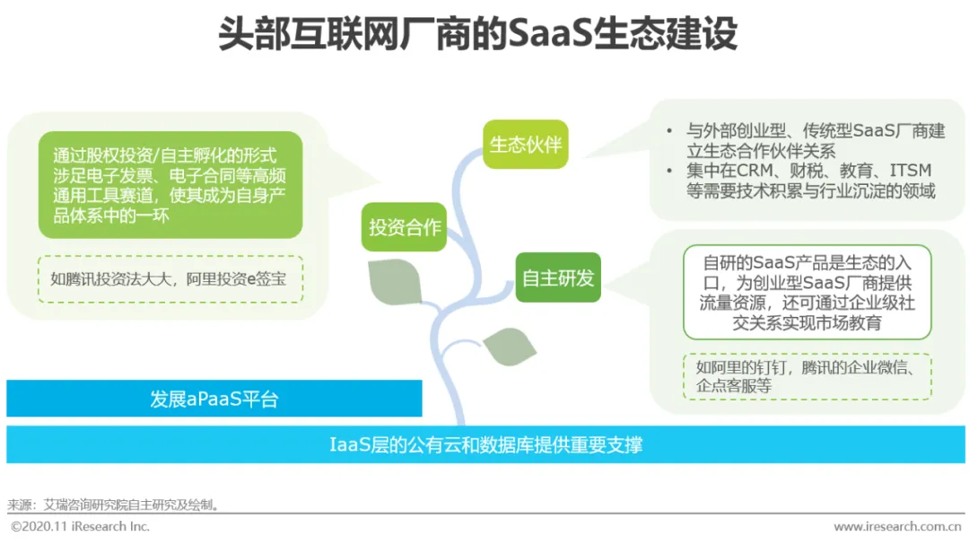 随着C端流量红利见底,国内互联网巨头逐渐有更大的动力探索B端增长,以阿里、腾讯为代表的头部互联网厂商从公有云入场B端,为进一步提升公有云覆盖力,扩大其在B端的市场份额,厂商们开始逐渐向上构建SaaS生态。如果说C端的竞争是流量的竞争,那么B端市场将会是生态的竞争。跨界而来的互联网厂商利用IaaS层技术沉淀,构建aPaaS应用市场,使得SaaS产品具有更强的扩展性和定制能力,而后从自主研发、投资并购和生态合作三个层级围绕优势产品建立SaaS生态,一方面作为被集成方为创业型SaaS厂商提供技术支持,另一方面也发挥流量和资金优势,现阶段以免费或低价的SaaS产品激活小微企业的使用意愿。