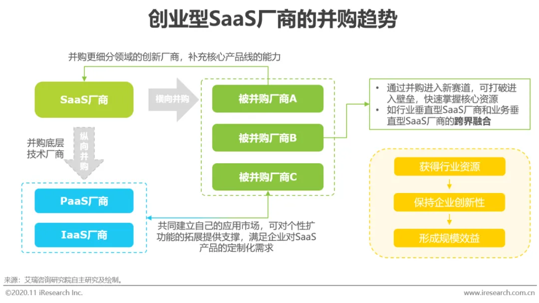 现今在一些细分赛道已经出现了较大体量的创业型SaaS厂商,在历经技术驱动的洗礼和业务体系趋于完整后,市场端的规模扩张逐渐成为发展趋势,产业内并购加剧。对于头部的创业型SaaS厂商而言,有两个主要的并购方向,第一是纵向并购,向产业链上游并购PaaS层厂商,加强SaaS厂商aPaaS平台的构建,以及IaaS层技术能力,自建公有云;第二是横向并购通过并购专注于创新业务、细分业务的厂商,保证自身的技术创新能力并增强垄断力,通过对企业已有业务体系的调整和补充,构建企业级SaaS产品生态,达到最佳经济规模。