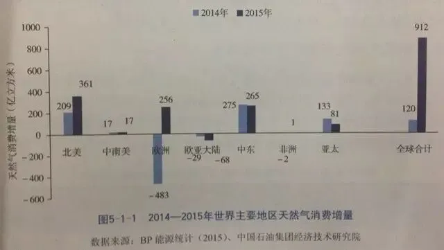 ▲2014-2015年世界主要地区天然气消费增量。