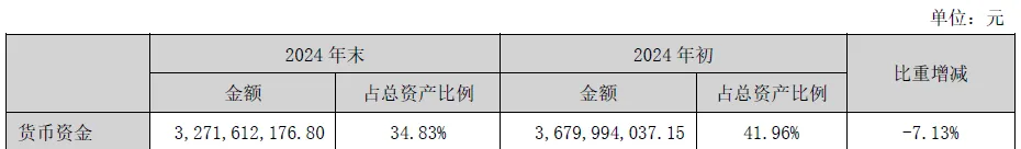 货币资金绝对值减少4.08亿元,占比下降7.13个百分点,但仍保持在较高水平。