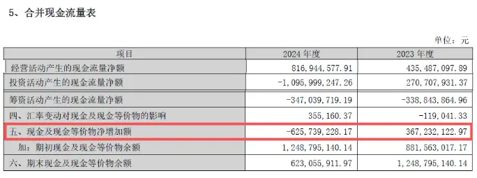 2024年,公司的“现金及现金等价物”大幅减少了6.26亿元,主要用于投资理财和项目建设。