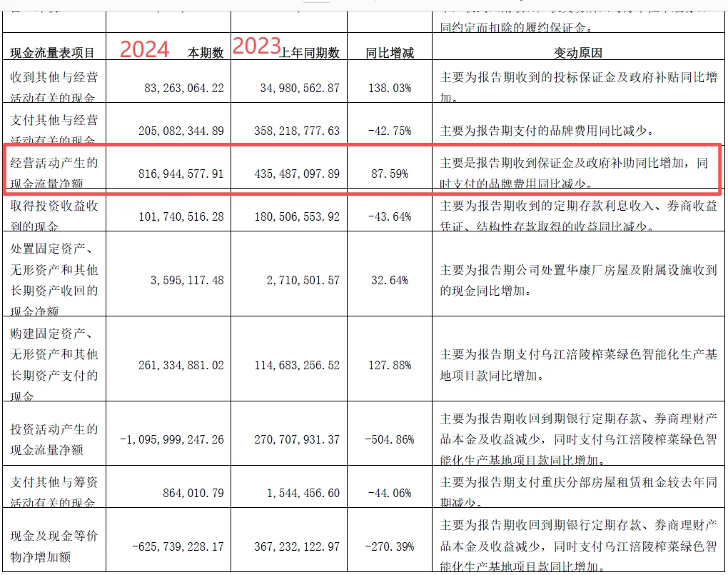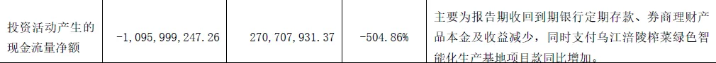 1.投资活动:支付乌江涪陵榨菜绿色智能化生产基地项目款2.61亿元。