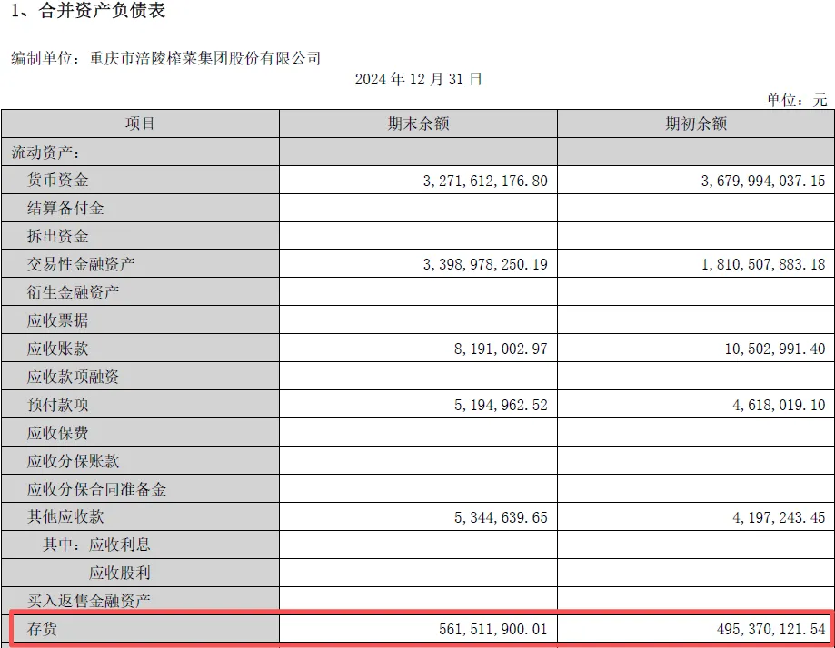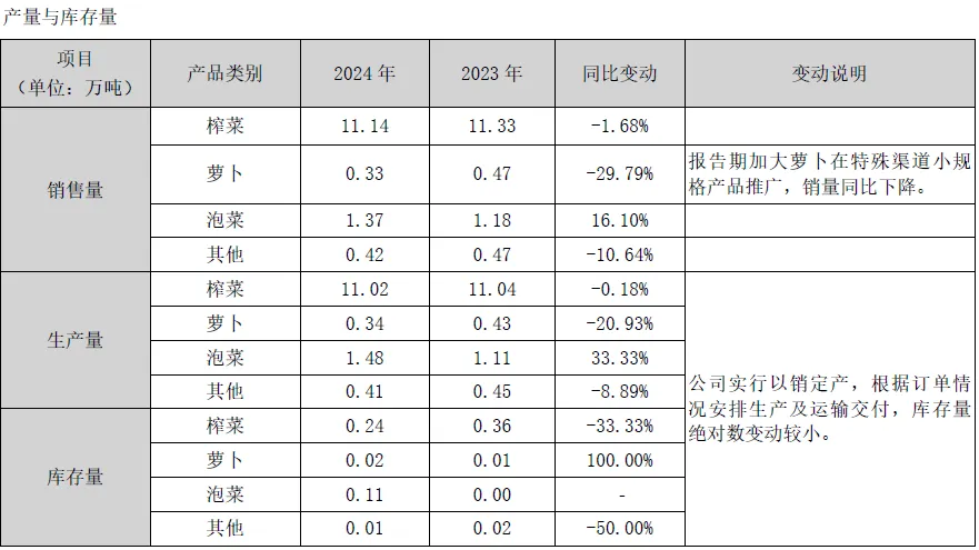 公司在年报时点(12月31日)持有较多的青菜头原料,是为接下来一年的生产做储备,这是正常的、战略性的备货行为,而非产品滞销,且结合产销存数据与存货结构分析,期末产成品库存绝对量在下降,说明生产出来的东西基本都卖出去了,并未在仓库里大量堆积。