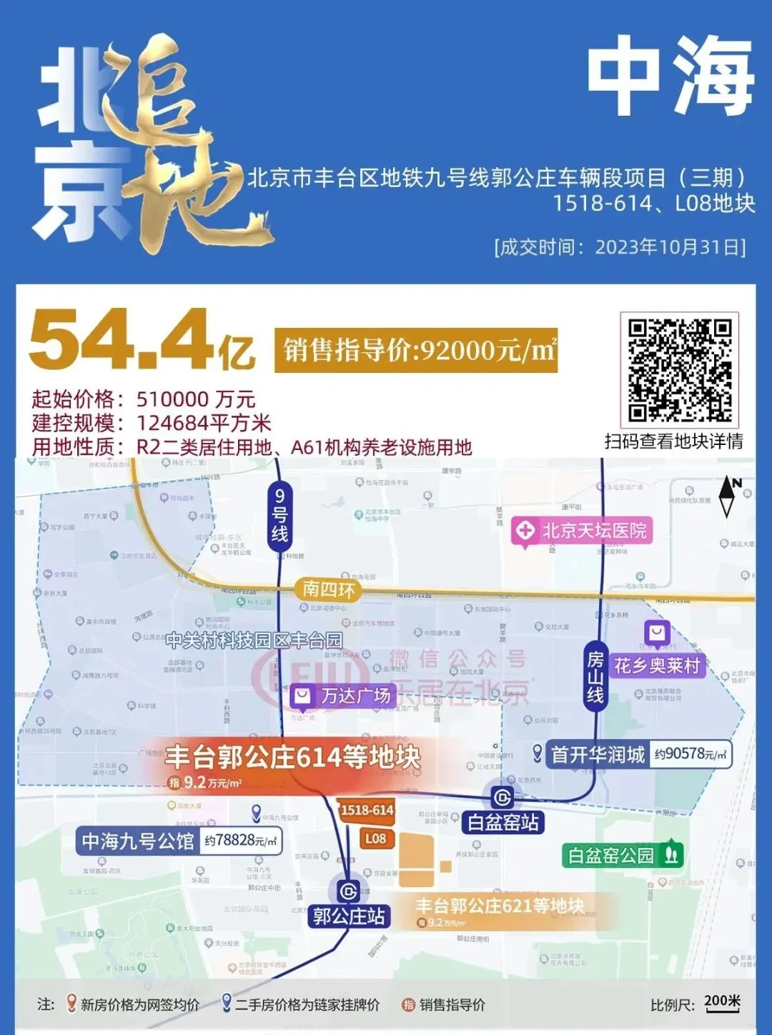 2023年10月31日,中海地产斥资54.4亿元,成功获取北京市丰台区郭公庄614地块——该地块总建面12.5万㎡,其中配建约3.8万㎡养老设施用地。