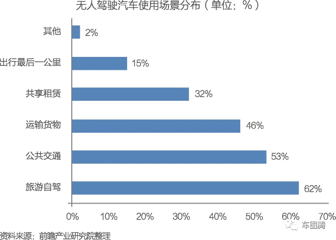 数据显示,62%的消费者希望在旅游自驾过程中体验无人驾驶汽车,53%的人希望无人驾驶技术应用于公共交通,46%的希望可以运输货物。虽然目前无人驾驶汽车还没大范围推广,但其适用领域逐渐显现。未来无人驾驶汽车将会渗透到人类活动各个方面,提高人们出行质量。