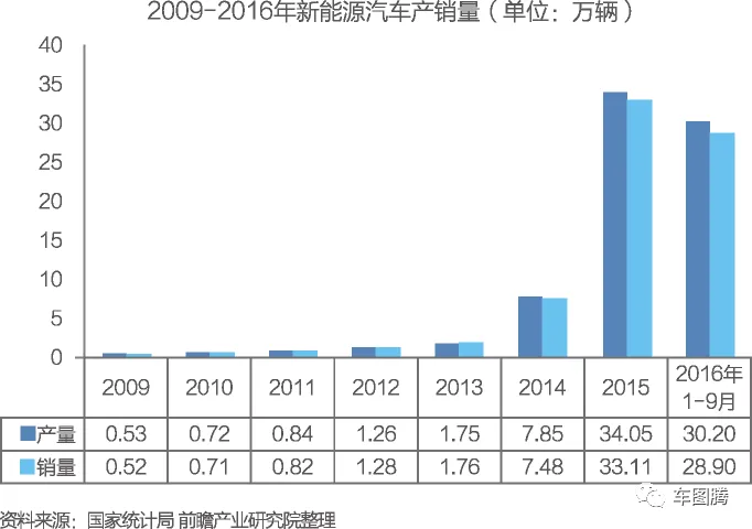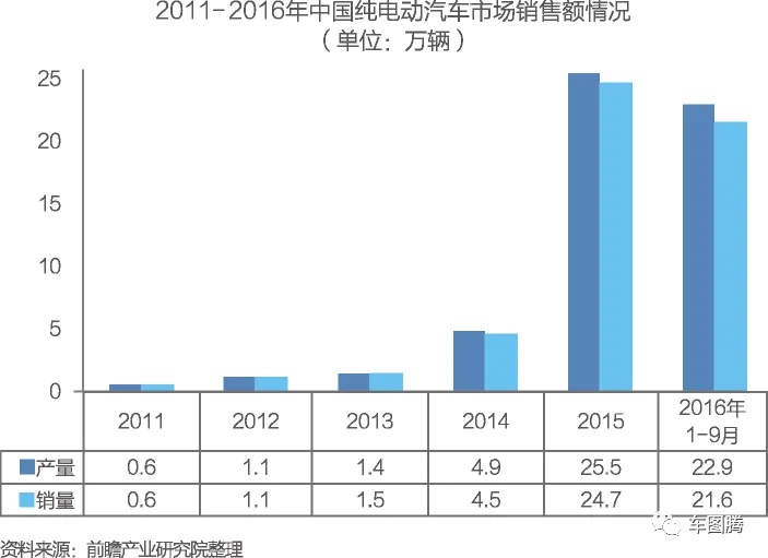 2014年,我国纯电动汽车产销48605辆和45048辆。2015年,纯电动汽车产销分别完成254633辆和247482辆,同比分别增长4.2倍和4.5倍。2016年1-9月,纯电动汽车产销分别完成22.9万辆和21.6万辆,比上年同期分别增长118.1%和128.4%。