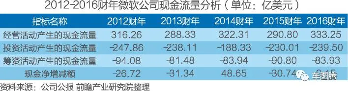 2016财年,公司经营活动产生的现金流量为333.25亿美元,同比上年增长14.60%,公司投资活动产生现金流量为-239.50亿美元,公司筹资活动产生的现金流量为-83.93亿美元,说明公司利息支出等较多,公司现金净增减额为9.15亿美元,有利于公司运营。