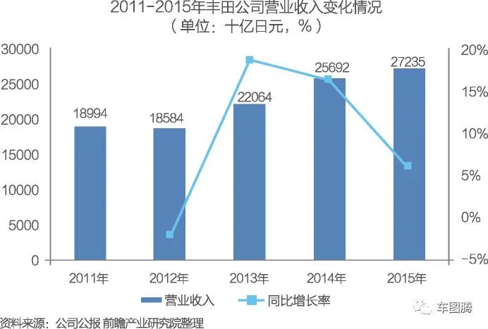 2011-2015年,丰田公司营业收入总体上呈现上升的趋势。2015年,丰田公司实现营业收入达到27235十亿日元,比去年同期增长6.01%。