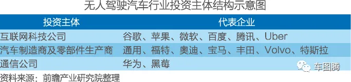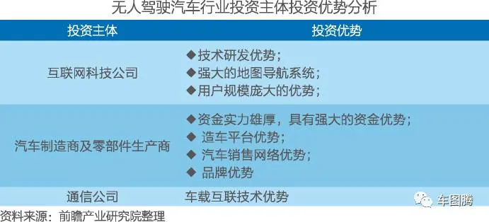 无人驾驶汽车行业各投资主体投资优势如下表所示。