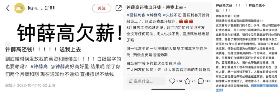 从去年的雪糕刺客,到今年的员工刺客,不知道钟薛高创始人林盛玩不玩刺客信条。时刻让自己处于风口浪尖,每半年一个热搜,以真诚换取消费者的误解,这高举高打的做派,和林盛的性格,据说很像。但高调显然没能给这家公司带来格调。相反,随着员工讨薪事件发酵,钟薛高的品牌形象一地鸡毛。前两周,多位网友集体声讨钟薛高从8月就因为现金流问题大批裁员,然后又以“等融资”为借口拖欠发放工资和赔偿金。虽然企业回应一切安好,但其公众号、微博停更两个多月已经是不争的事实。钟薛高拖欠员工工资被声讨