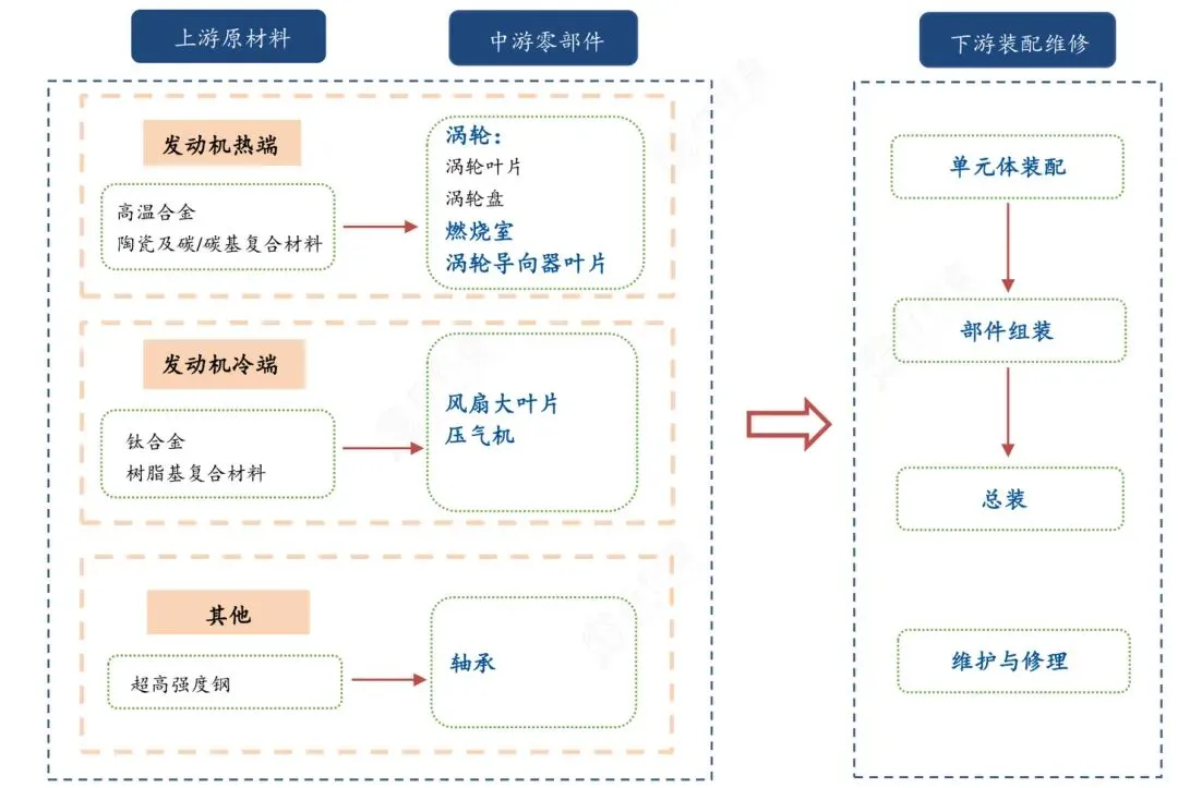 我国目前已具备完整的航空发动机产业链的研发制造能力,产业链涉及从上游材料到下游总装等多个环节