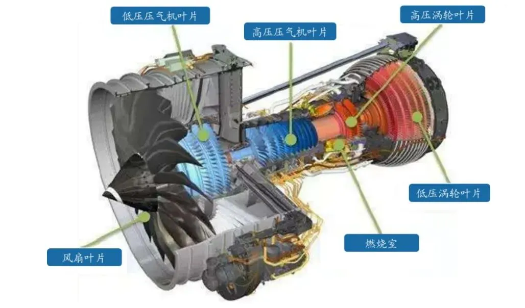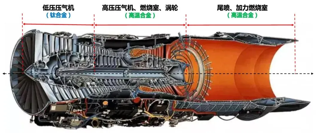 航空发动机中使用的材料主要有高温合金、钛合金、复合材料、合金钢、铝合金等。