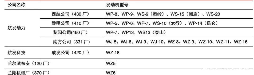 本部西航公司(430厂)以研制大中型军用航空发动机为主,子公司黎明公司(410厂)主要以研制中大推力航空发动机为主,黎阳公司(460厂)是我国中等推力涡喷、涡扇发动机的重要生产基地之一,南方公司是我国中小型航空发动机主要供应商,研制多型号涡桨和涡轴发动机。