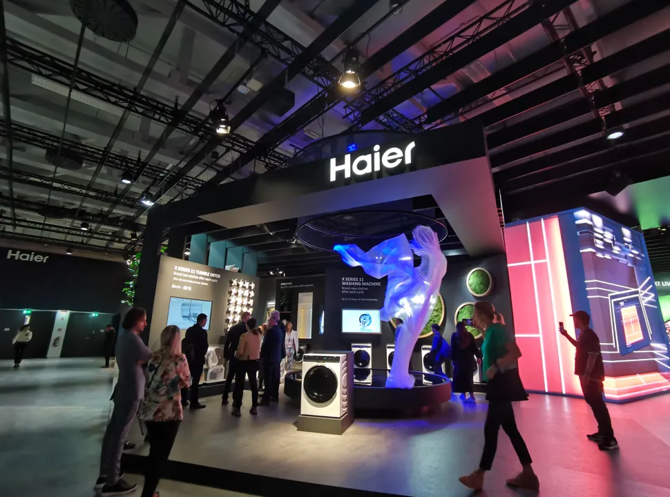 在展示效果上,中国家电企业也成为现场的焦点,例如携旗下海尔、卡萨帝、Candy、Hoover四大品牌亮相的海尔,不仅展示了冰箱、洗衣机、酒柜、厨电等多品类多系列的高端产品,同时还带来全场景的智慧家庭体验,遍布全场的hOn App可同时管理海尔、Candy、Hoover三大品牌的所有场景及产品,此外,海尔展台还非常有设计性,搭载创新ultra fresh新风功能的海尔X11系列洗衣机背后的风吹丝绸,是中国式专属浪漫。