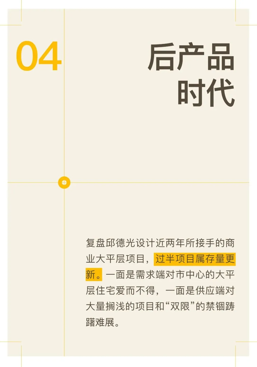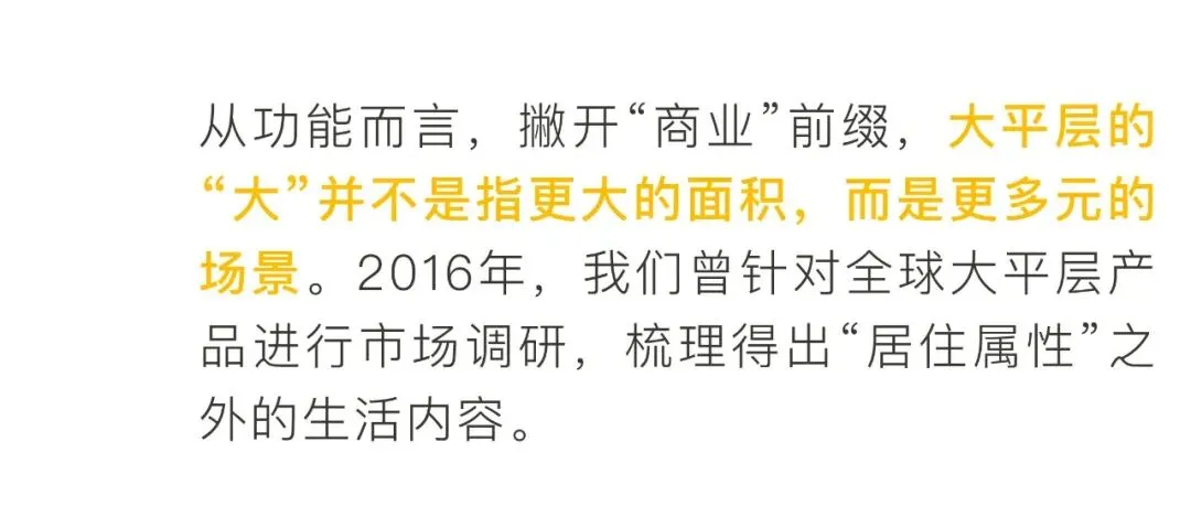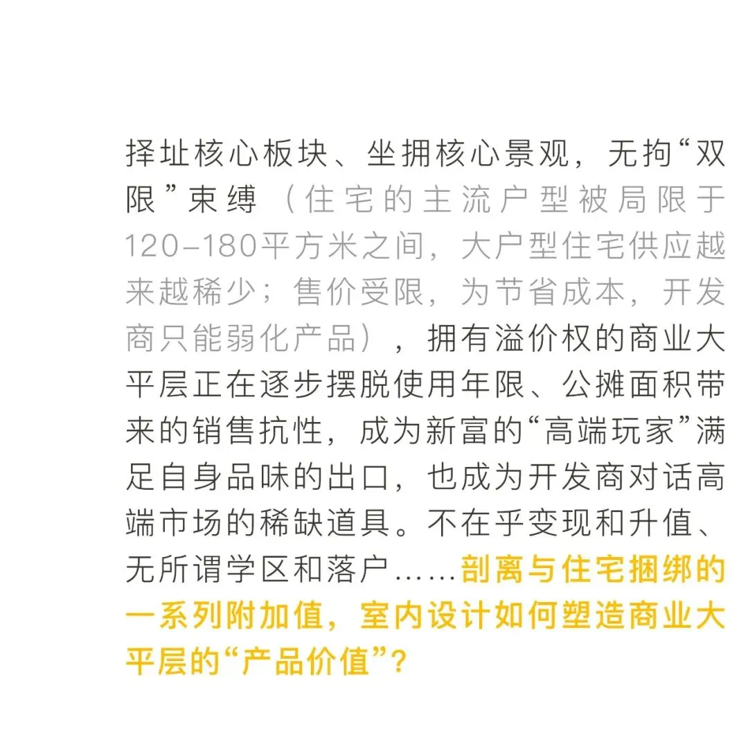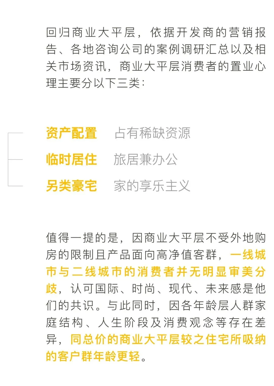 2年,10余座城市,近20个在施或已落成商业大平层项目,超平均水平的装标(精装标准1万+/m²)……切身感受这一“新物种”的热度后,我们基于既有项目,针对其各自城市的客群需求、设计表达进行汇总和再调研,归纳整理出一份《商业大平层产品趋势报告》内容如下。