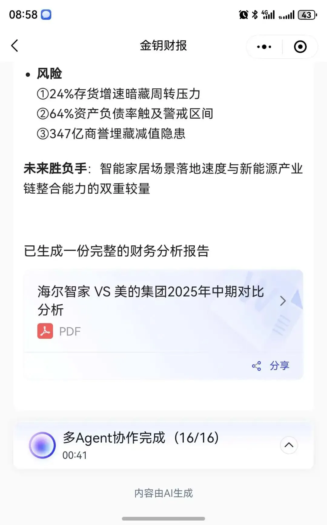 上次只体验到了财报分析,最近公司发福利,终于领到了VIP,继续来看看其他功能吧:不多说,直接上结果,挑了两家产品我都喜欢,并且都买过的公司进行对比分析,已经更新了2025年上半年年报了噢~~~这里最多可以选择5家公司进行对比分析,但目前仅只支持国内上市公司和新三板上市公司。分析结果如下:1、整体功能体验很流畅,上市公司财报数据也更新得比较及时2、如果用于投资辅助,建议还是要谨慎,因为投资有风险,除了财报,还有很多方面的影响。如果有想体验或申请VIP资格的,可以给我留言,或加我微信好友。