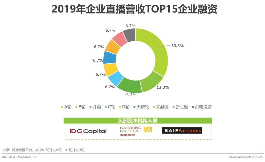 基于ToB生态的企业直播在2015年后进入发展的快通道,微赞、展视互动等企业经过多年积累和进化,企业直播服务已从最初的直播平台技术服务商慢慢向综合性深度应用服务商转型。一方面基于直播平台的SaaS生态,通过应用插件、数据化工具等不断丰富企业直播服务功能,逐步满足客户多样化行业特性和场景需求,另一方面,中国人口红利逐步消失,资本不断加码ToB企业服务赛道,企业直播服务行业从2015年后备受资本青睐,直播营收TOP15中未融资比例仅为6.7%,头部资本IDG、高榕资本等纷纷入局,充足资金支持下企业直播赛道玩家日臻成熟。