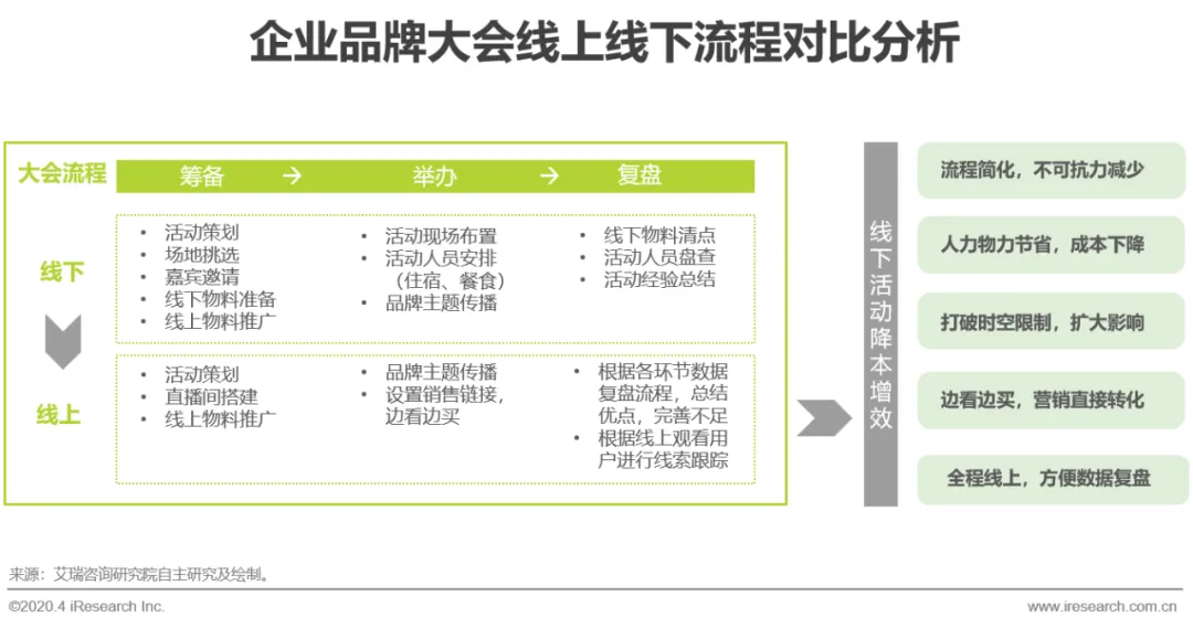 而在此次疫情影响下,全流程线上化的被迫尝试一方面帮助企业形成较固定的流程范式,后续维持和操作方便快捷,另一方面,企业通过在线直播解决了企业传统线下活动的诸多痛点,成本角度上,大大降低组织和人力成本,尤其大型活动和培训涉及较复杂的人员接待和安排,不仅花费高昂,且时间精力付出大;活动效果上,突破时间和空间的限制,相比线下有限的场地和固定的时间,线上直播只需要有一台智能手机,便可以随时看、随地看,快速实现影响范围的扩大。