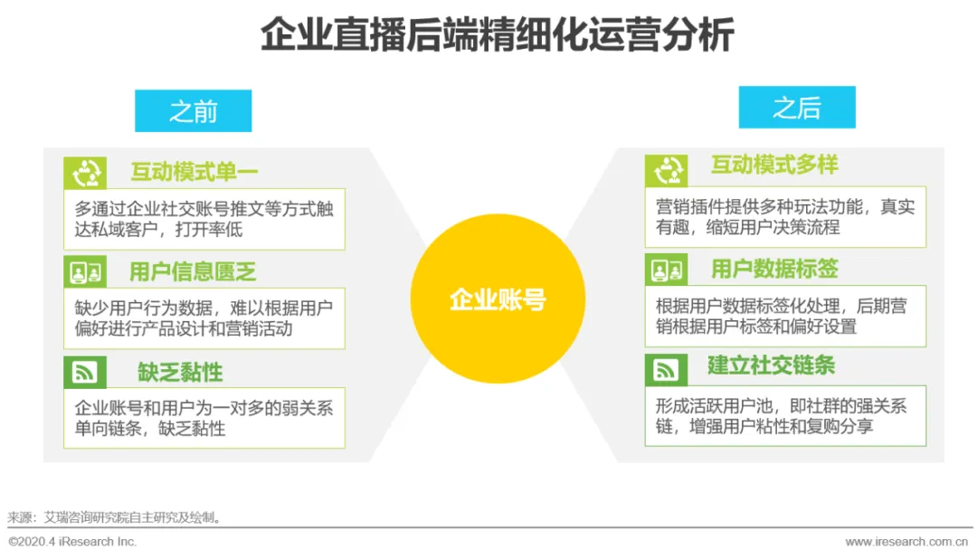 企业直播不仅为下游企业提供用户引流、获客、转化、留存提供一站式营销服务,更重要的是以企业直播账号为载体进行私域流量的运营和沉淀,通过数据化工具和多种互动模式形成用户数据标签和活跃用户池,帮助企业实现品牌社交资产的激活与增值。