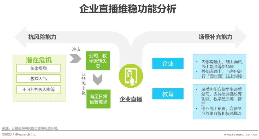 线上场景的迁移提高了各行各业的抗风险能力,并完成了用户教育和全流程部署,疫情后出于线下场景补充和风险应对考虑,企业直播的线上场景或成企业标配。