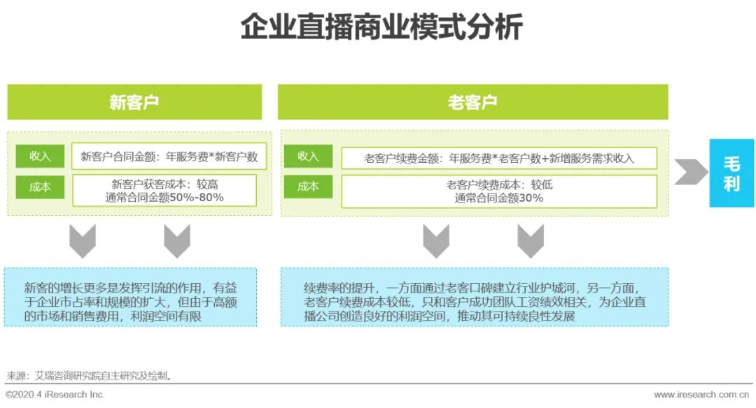企业直播商业模式主要是为企业客户提供直播相关的SaaS软件及增值服务,定期收取费用,部分企业还提供营销策划服务与直播硬件采买服务等。其核心收入由新客户的合同金额与老客户的续费金额构成,两者比较而言,新客户需要花费较高的市场和销售费用,虽有利于市场的快速扩张但对公司利润空间助力有限;而老客户续约不仅能够形成行业优质口碑,更重要的是年付费金额不变的同时市场和销售费用大幅下降,进而为企业直播公司带来良好的现金流和利润空间,此外,老客户的续费通常伴随着新需求的产生,推动企业直播公司的可持续良性发展。