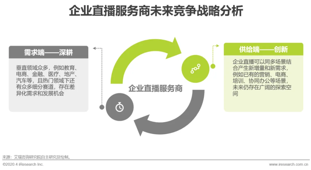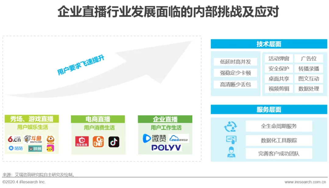 从具体产品和服务来说,2015年后的秀场、游戏千播大战使得直播模式深入用户的娱乐生活,2018年后的直播电商使得直播模式深入用户的消费生活,2019年后的巨头入局和疫情使得直播模式已经融入用户工作和生活的方方面面,因此,用户对于直播产品和服务的要求也不断提升,给企业直播服务商带来新的挑战。