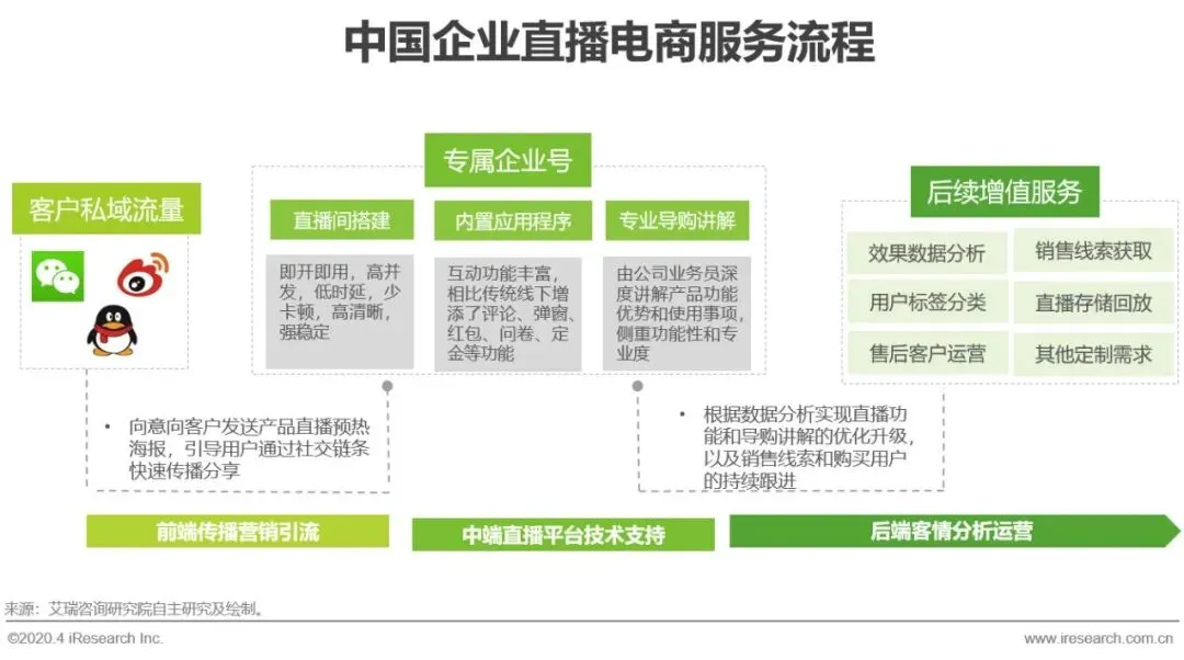 企业直播服务公司通过前端传播营销引流、中端直播平台技术支持和后端客情分析运营,贯穿企业产品线上销售全流程,为企业提供用户导流、转化、持续管理的一体化服务,一方面,助力企业实现私域流量盘活,提高用户粘性和付费转化率,另一方面,还可通过沉淀的用户数据还原用户消费路径,进而不断迭代互动及销售模式契合用户偏好。