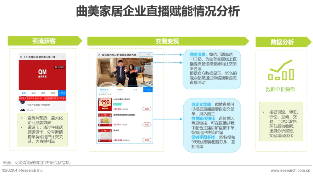 以微赞的典型客户曲美家居为例,曲美家居在疫情冲击下通过微赞创建直播间,2月19日开始累计直播400余场,直播访问累计超千万,斩获订单超6万,预计转化销售超4亿元,在实体产业整体萧条的大背景下实现逆势上扬,收割大量线上红利,构建起自有品牌私域流量池,并计划未来将在线直播作为线下销售的重要补充场景实现常态化。
