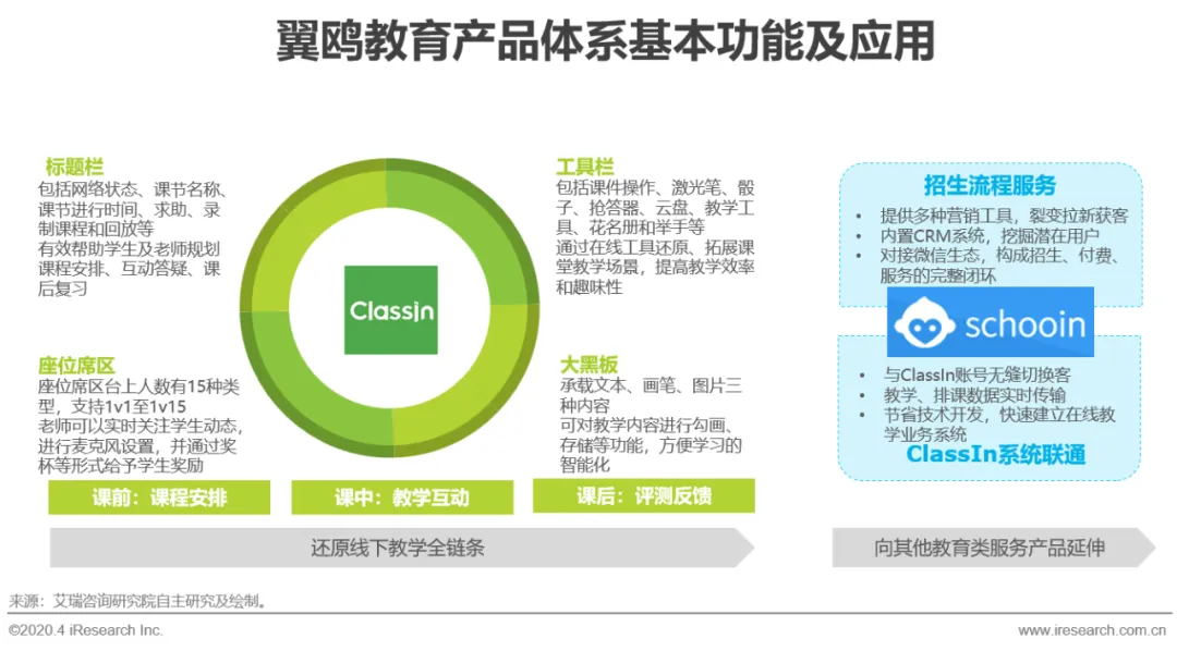 翼鸥教育成立于2014年,专注于教育领域直播服务,通过自主研发的多路音视频技术打造在线直播底层应用,目前客户涵盖新东方、好未来、英孚教育等多家头部教育机构。2015年首款在线教室产品ClassIn上线,聚焦于教学设计开发,支持多种课堂模式,2017年7月发布开源系统Schooln,聚焦于在线教育机构服务,帮助机构完成招生、课程推广、付费监课全过程,并无缝衔接ClassIn,实时了解教学情况和后台数据,此外,翼鸥教育另一套TeacherIn系统也在规划中,将聚焦教学资源和教师培训领域,通过产品矩阵打造,为在线教育提供一站式解决方案,不断增加服务半径,获得协同效应。