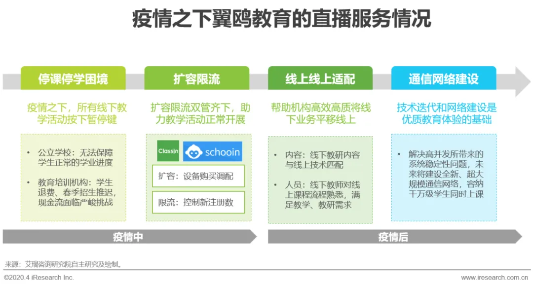 为牢牢把握低价获取大量流量的机遇,翼鸥教育快速系统扩容,较短时间内恢复系统的稳定性,一方面快速采购各种专线、带宽、云主机、软硬件设施等,解决流量拥堵问题,另一方面,采取限流措施,保证服务的基础质量,此外,在快速收割流量的同时彰显社会责任感,针对公立学校,免费开放ClassIn平台,对于其他线下培训机构客户统一优惠20%,武汉地区机构优惠30%,助力教育机构上课、答疑、班会、教研讨论会、家长会、模考、作业、自习全面线上化和信息化。