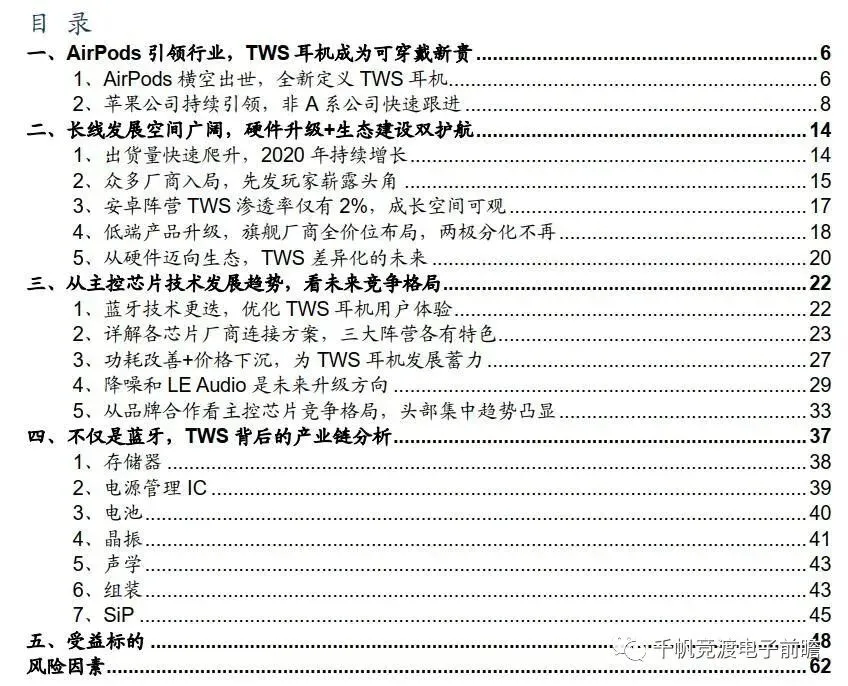 风险因素:疫情持续时间过长,影响需求;TWS耳机渗透进展不及预期;芯片技术进步不及预期;LE Audio等新技术开拓不及预期。