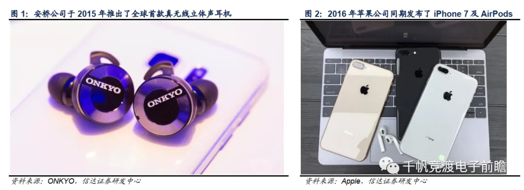 2016年9月8日,苹果公司于秋季新品发布会上发布了AirPods,使得TWS耳机真正意义上进入公众视野。同时,苹果在当届发布会上还发布了首款没有3.5mm耳机孔的智能机iPhone 7。这两款产品均是对过往消费电子产品形态的巨大革新,引领了后来的产品形态创新。