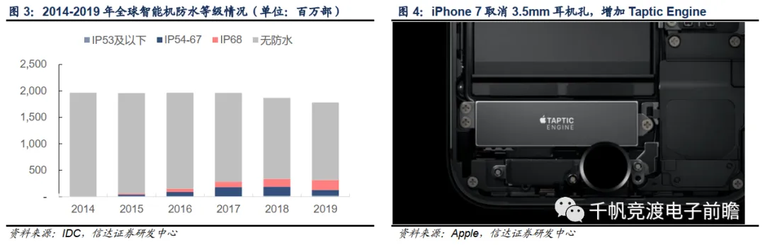 作为首款取消3.5mm耳机接口的智能机,iPhone 7通过减少手机外部接口,创新性地解决了智能手机易进水的缺陷,同时支持IP67级别的防水功能。据IDC统计,2019年内IP68防水等级的手机占比已达13.02%,而2017年这一比例仅为6.06%。此外,3.5mm耳机接口模块的移除,也大为节省了手机内部空间,iPhone7利用手机内部多余出来的空间放置了一枚Taptic Engine震动马达,带来了更好的震动效果。