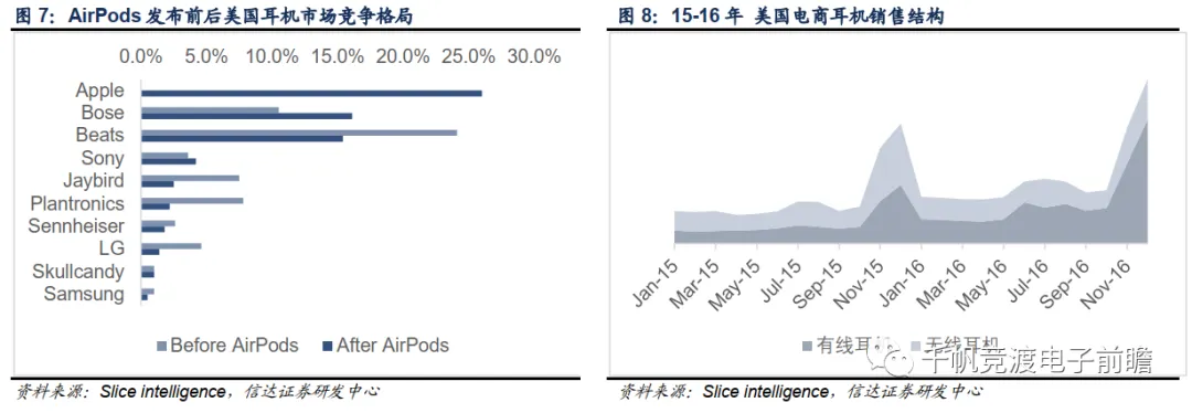AirPods作为苹果公司2016年的压轴产品,自发布后仅用时一个月就以26%的市占率成为美国销量最高的耳机。此外,AirPods还带动了无线耳机的销售热潮,根据Slice intelligence 数据,2016年底,美国电商耳机市场中无线耳机占比大幅提升至75%,显现出对传统耳机的强劲替代趋势。