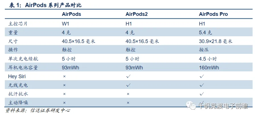 2019年3月和10月,苹果又相继推出了AirPods2和AirPods Pro。两款产品都搭载了新一代H1主控芯片。其中AirPods 2更新了语音控制和无线充电功能。AirPods Pro引入了SiP封装,进一步提高了内部元器件集成度,利用节省出的空间,加入更多的传感器和芯片,实现了主动降噪功能,并且缩小了耳机整体尺寸,增加了其便携性,AirPods Pro还通过结构改进实现了IPX4级别的抗汗防水。一系列增值功能的引入是AirPods系列产品迈向高端耳机的重要一步,此外,苹果亦有望于2020年内发布全新的头戴式AirPods及入门款AirPods。