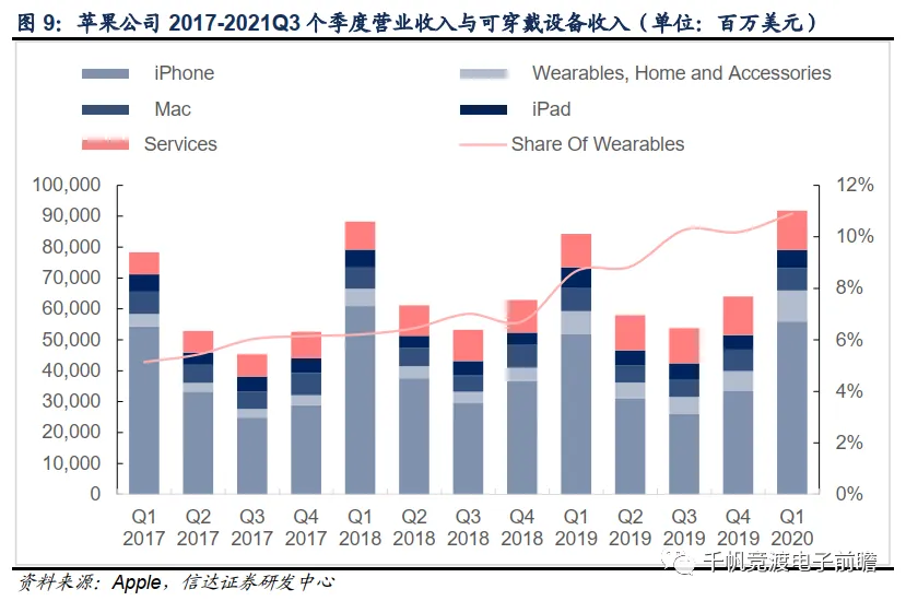摆脱了传统耳机物理连接的束缚,AirPods展现了有线耳机和传统蓝牙耳机难以比拟的便捷舒适。市场也证明了这款产品的成功,苹果公司在传统手机业务销量表现疲软的情况下实现了可穿戴设备营收的高速增长,2020年第一季度可穿戴设备营收达总营收的10.9%,同比增长36.9%,成为公司成长的主要驱动力。