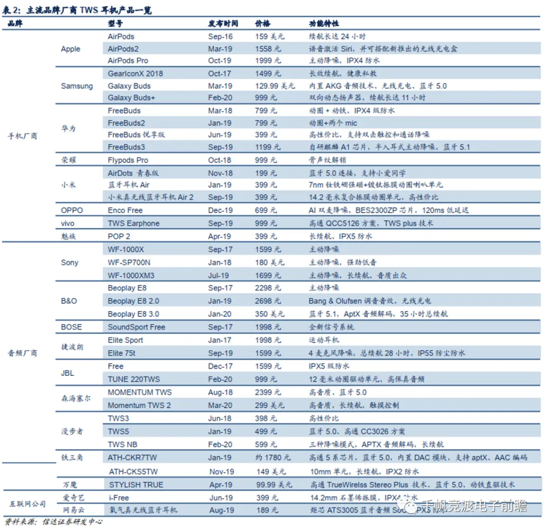 我们在此统计了2017-2020年间,各主流品牌厂商的TWS耳机产品。可见业内公司均在积极布局TWS耳机市场,新品发布不断加速,呈现百花齐放的态势。(1)手机厂商:华为、小米等手机品牌注重与自家智能手机等产品的适配,以TWS耳机作为自家语音助手交互入口,优化多场景应用将TWS耳机融入自家智能产品生态圈;(2)传统音频厂商:森海塞尔、铁三角等传统高端音频厂商则在其TWS耳机产品上发扬一贯的音质优势,支持高清音频编码;(3)互联网公司:爱奇艺、网易云等互联网公司则依靠与自家互联网产品的联动推出耳机硬件。