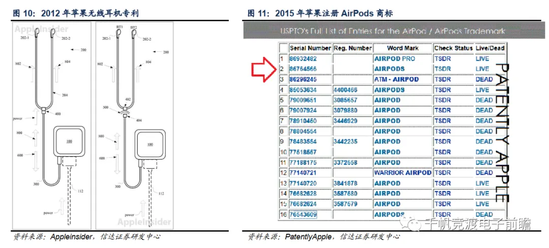 我们认为,TWS耳机需要把原有的信号接收模块、解码放大模块、通讯模块以及电池等零部件全部装近拇指大小的设备中,还要保证连接性和一定的音质效果,具有体积小、集成度高、技术难度高等特点。相比其他厂商,苹果公司早在数年前就已提前布局TWS耳机领域,并持续投入研发。通过查阅美国商标专利局网站,可见苹果公司在2010年起就在不断申请无线蓝牙耳机专利,并在2015年10月注册了AirPods品牌商标。