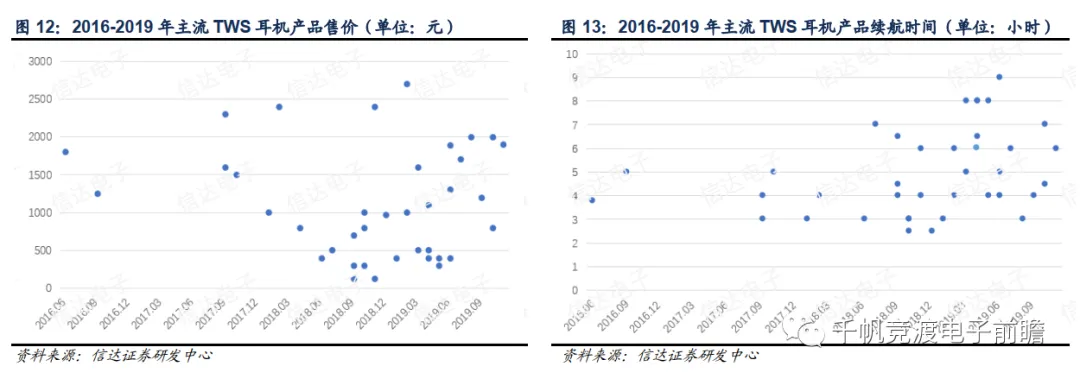 然而随着TWS耳机技术的不断成熟,市面上非A系TWS耳机产品的连接性能大为改善,续航持续提升,价格逐渐下沉。为TWS耳机的爆发奠定了基础。我们对TWS耳机的发售节奏做进一步分析可见,2018年下半年之后,非苹果TWS耳机大量发售,且价格大多在1000元以下。同时间段内,续航时间超过6小时的产品开始出现,部分产品续航时间高达八、九小时。进入2019年,新发售产品的续航时间就再无低于三小时。配合充电盒使用时间,大部分TWS耳机使用时长可超过20小时,甚至有产品超过60小时。此外,近期发售的新款TWS耳机中,主动降噪、防水、防汗等功能也开始逐渐普及,大幅提升了产品的用户体验。